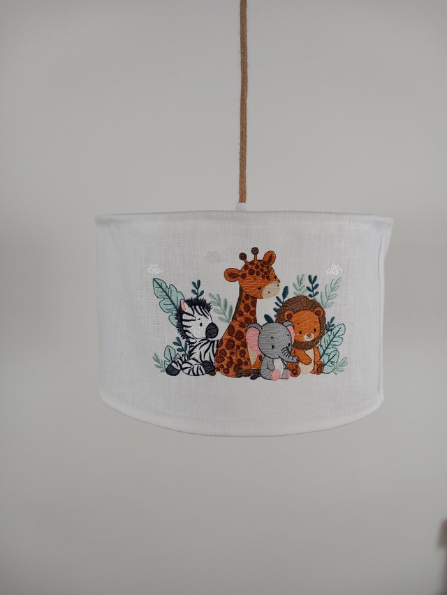 Abat-jour lin chambre enfant brodé - trois broderies Animaux de la savane - suspension diamètre 35 cm
