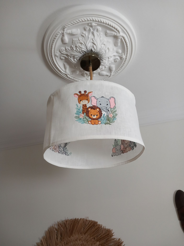 Apportez une touche ludique et colorée à la chambre de votre enfant avec cet abat-jour pour suspension en lin blanc, brodé de trois broderies différentes , chacune composée des adorables animaux de la savane : girafe, lion, zèbre et éléphant. Une création artisanale unique, réalisée dans mon atelier Lin-en-Lumière à Uzès.