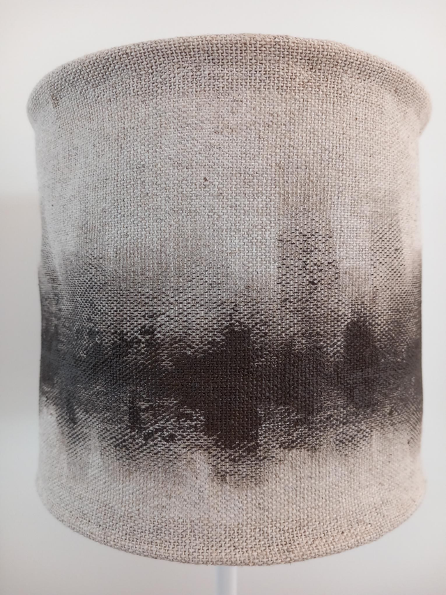 Cet abat-jour rond en chanvre naturel peint à la main est fabriqué dans mon atelier Lin-en-Lumière à Uzès. Son textile crème peint de motifs marrons effet tie and dye apporte une touche artisanale et unique à votre lampe de table.