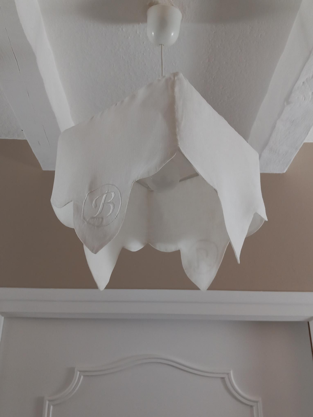 Abat-jour suspension carré en lin blanc brodé des lettres A et B sur 2 faces opposées, fabriqué à la main dans mon atelier Lin-en-Lumière près d’Uzès en France.