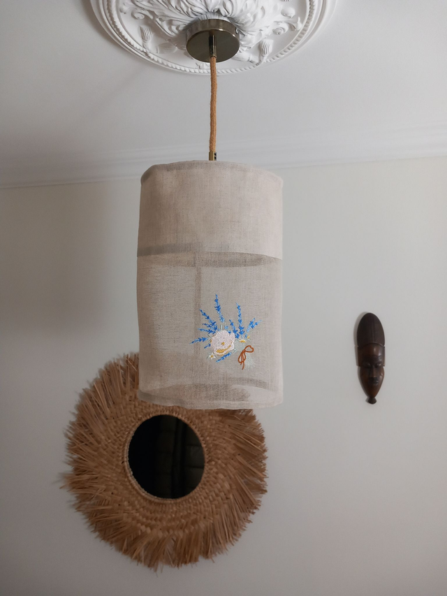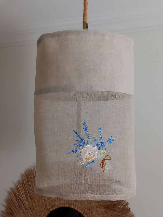 Abat-jour cylindrique réalisé en lin naturel beige (ficelle) et voile de lin assorti, décoré d’une broderie florale délicate : une lavande et une rose. Une création artisanale unique, conçue sans polyphane ni plastique dans mon atelier Lin-en-Lumière à Uzès en France .