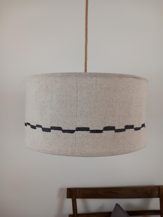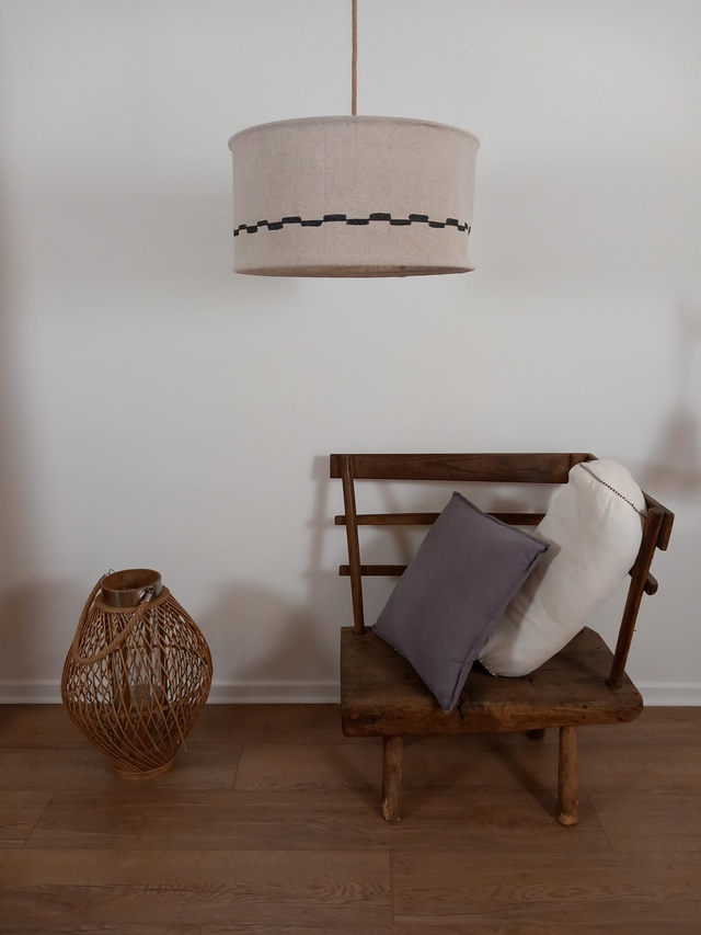 Abat-jour pour suspension rond tambour en chanvre peint à la main, fabriqué dans mon atelier Lin-en-Lumière près d’Uzès, France. Disponible en diamètres 35 , 45 ou 50 cm, il apporte charme et authenticité à votre intérieur.