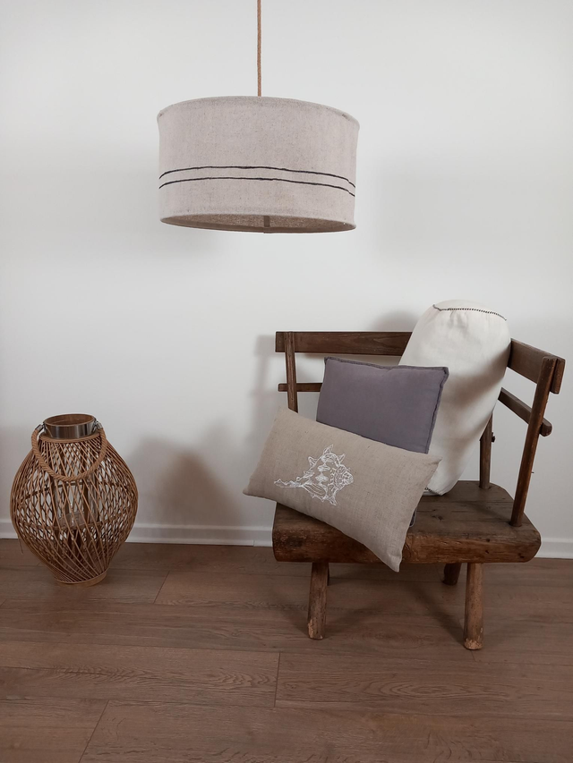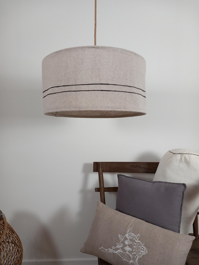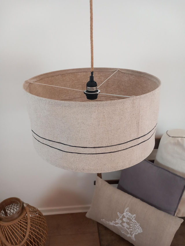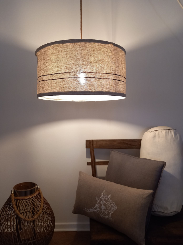 Abat-jour rond tambour en chanvre peint à la main, fabriqué dans mon atelier Lin-en-Lumière près d’Uzès, France. Disponible en diamètres 35 , 45 ou 55 cm, il apporte charme et authenticité à votre intérieur.