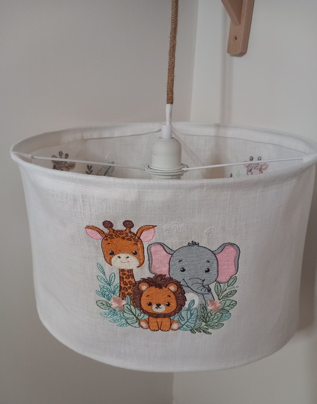 Abat-jour suspension en lin blanc brodé de trois décors Animaux Safari