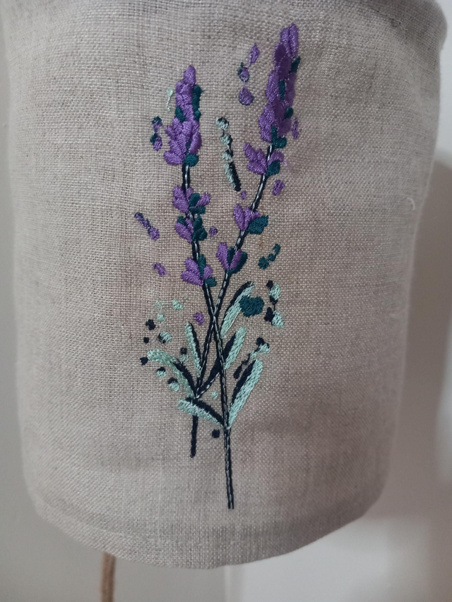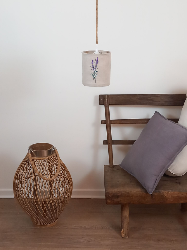 Cet abat-jour cylindrique en lin beige est brodé d’un motif Lavande violet et fabriqué à la main dans mon atelier Lin-en-Lumière près d’Uzès. Sa broderie fine et colorée met en valeur l’authenticité et le charme naturel du lin.