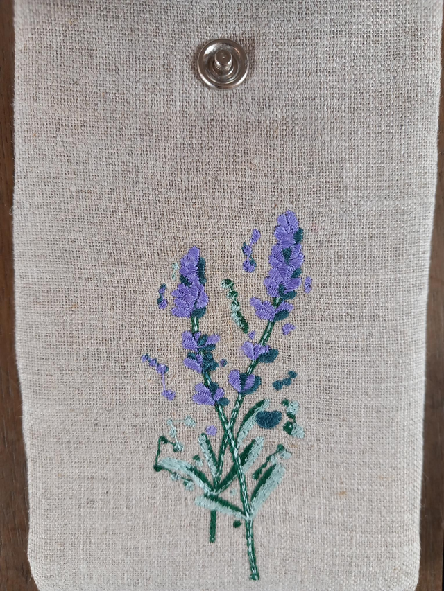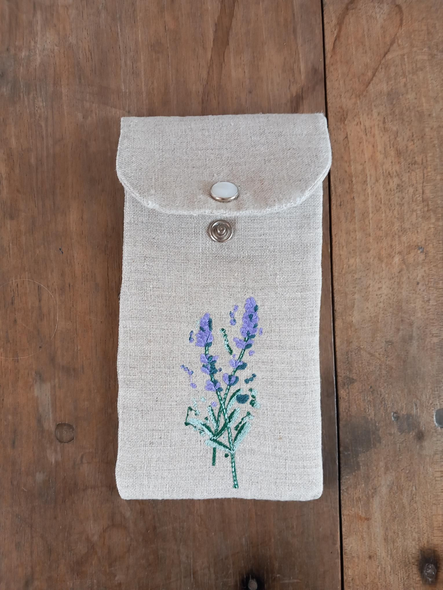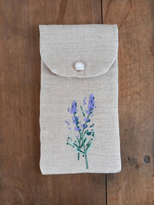 Étui à lunettes ou pochette téléphone en lin naturel brodé et molletonné, modèle Fleurs de lavande, fabriqué à la main dans mon atelier