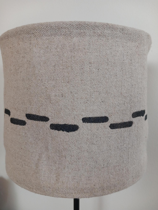 Cet abat-jour rond tambour en chanvre naturel peint à la main est fabriqué dans mon atelier Lin-en-Lumière à Uzès. Son textile crème peint de motifs noirs apporte une touche artisanale et unique à votre lampe de table.