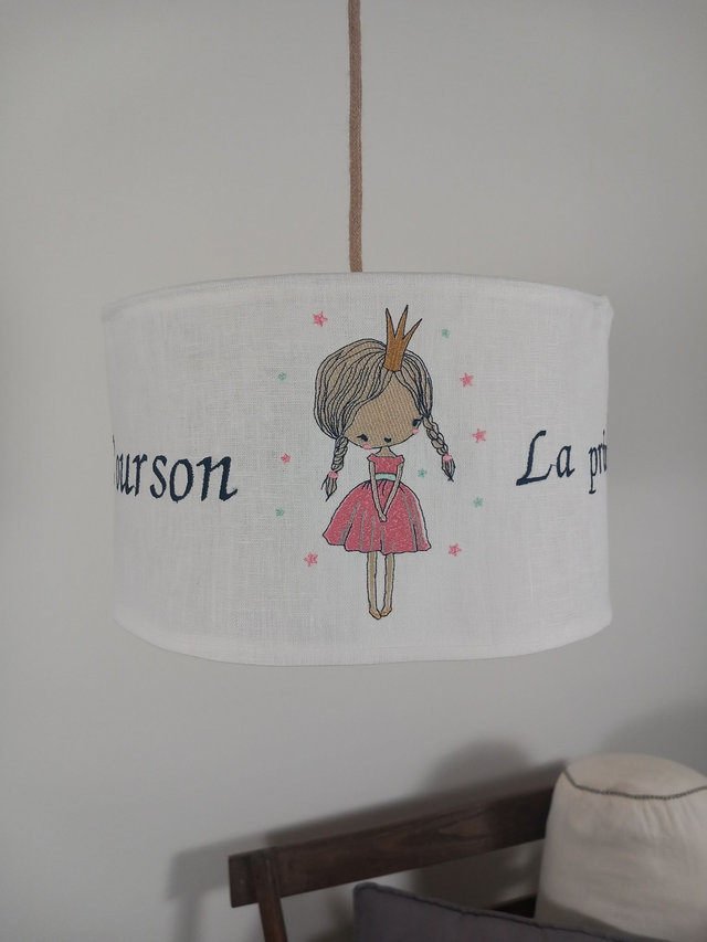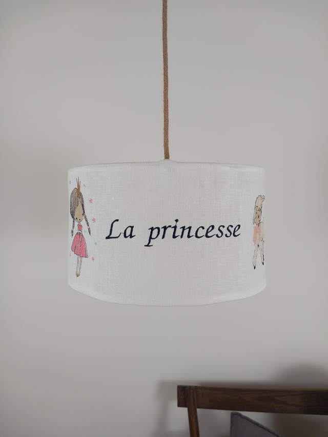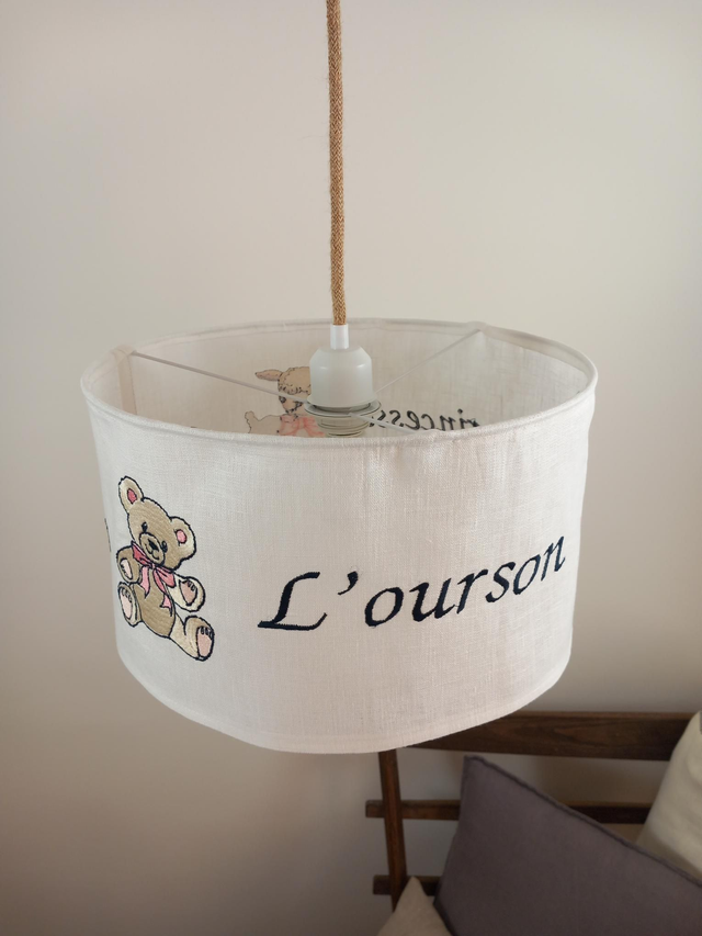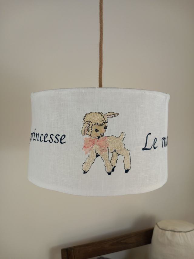 Apportez une touche ludique et colorée à la chambre de votre enfant avec cet abat-jour pour suspension en lin blanc brodé de trois broderies différentes, chacune composée des adorables décors : princesse, ourson et mouton. Une création artisanale unique, réalisée dans mon atelier Lin-en-Lumière à Uzès.
